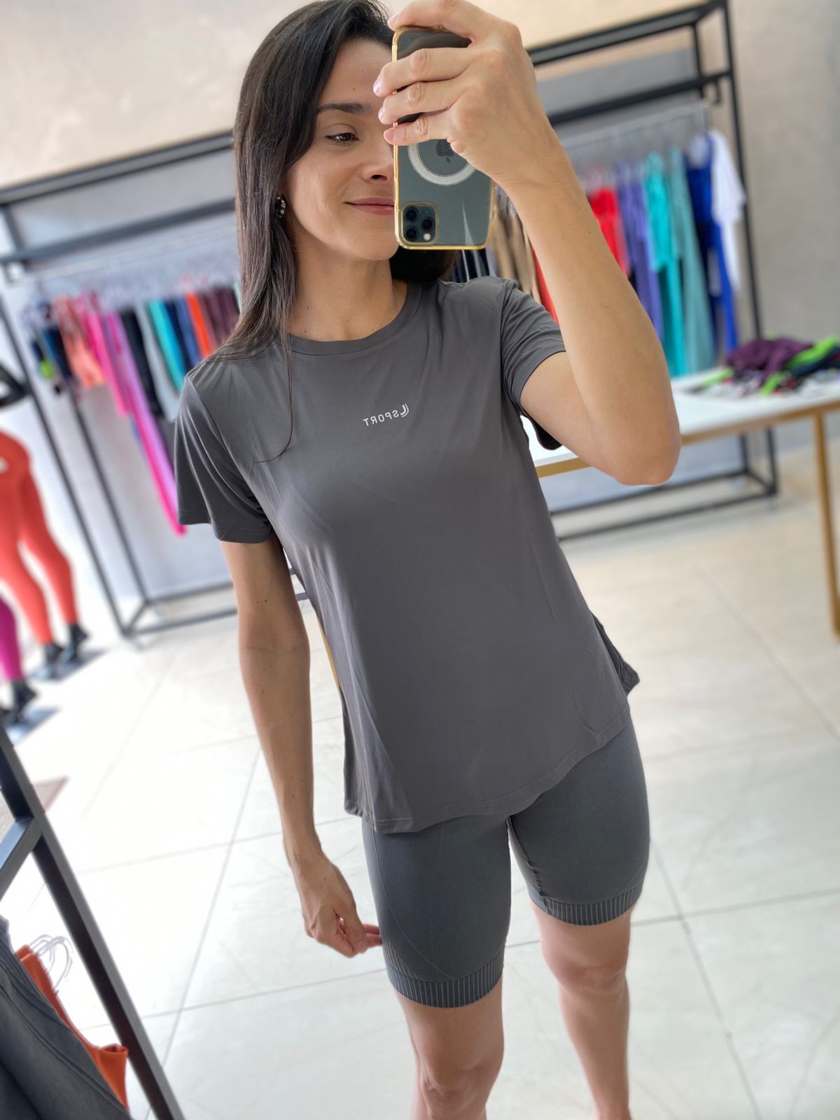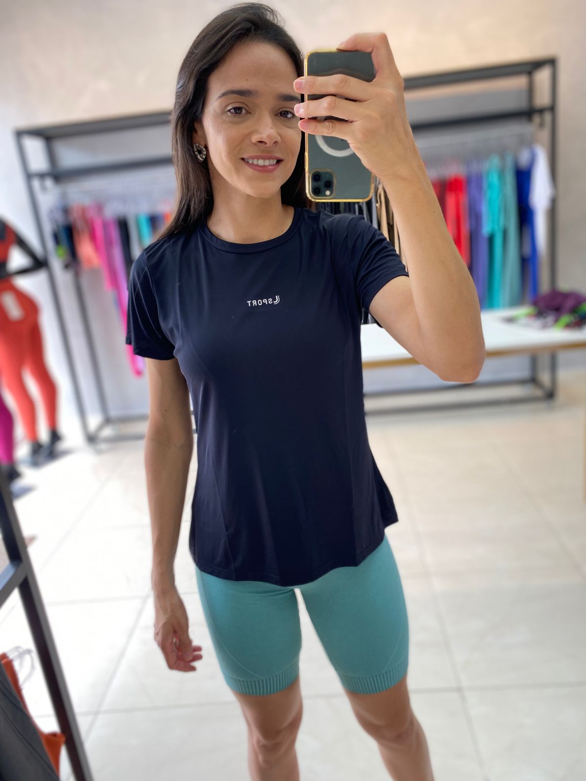 Camiseta básica com modelagem reta, manga curta e gola redonda. Possui transfer refletivo